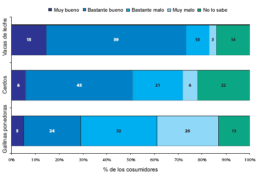 El 26 % de los consumidores británicos piensa que las condiciones de las gallinas ponedoras son muy malas y más del 32 % piensan que son bastante malas. En comparación, el 51 % piensan que los cerdos están muy bien o bastante bien y el 74 % piensan que las vacas de leche están muy bien o bastante bien.