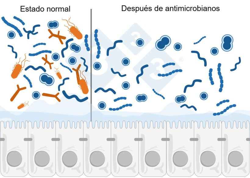 El mecanismo de acción de los antimicrobianos, orientado a la eliminación de patógenos, también termina afectando directamente a la microbiota y su equilibrio: