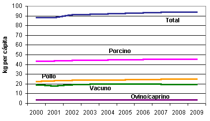 En la gráfica se presentan las perspectivas del consumo de carne a medio plazo por sectores. Según estas previsones, el consumo total de carne en la Unión Europea pasaría de 88,5 kg per cápita en el 2001 hasta 94 kg en el año 2009. La carne de cerdo, con una cuota del 50%, es con diferencia la carne preferida por los consumidores europeos, seguida por el pollo con una cuota del 25%.