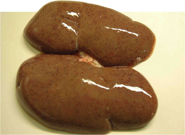 Fig.2: Imagen característica de bazo hemorrágico aumentado de tamaño en un cerdo afectado por PPA.