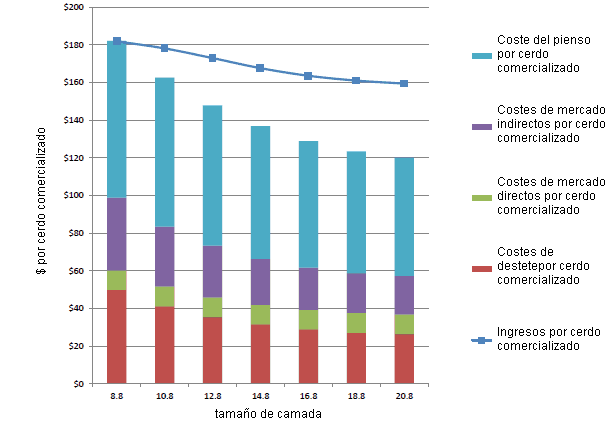Los costes calculados por lechones individuales muestran que el coste medio total por cerdo comercializado disminuye al aumentar el tamaño medio de camada. La figura 1 muestra los costes por cerdo comercializado según el tamaño de camada. Los costes totales de alimentación aumentaron al aumentar el número de lechones por camada, pero el coste de alimentación por cerdo comercializado disminuyó al aumentar el tamaño de camada. Esta disminución es debida a que en las camadas más grandes nacen lechones más pequeños, que permanecen a pesos inferiores en el sistema de producción, por lo que consumen menos pienso que los animales más grandes.