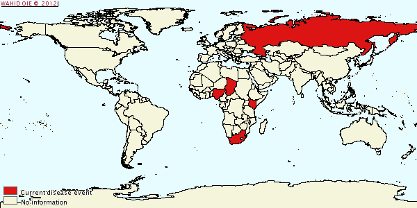 Según la OIE en 2012 se han producido casos, que siguen activos, en la República Centroafricana (2), Chad (9), Kenya (4), Rusia (176) y Sudáfrica (14), en Nigeria (1), donde es endémica desde 2008 y en Tanzania (9), donde se ha resuelto desde el 16 de enero.