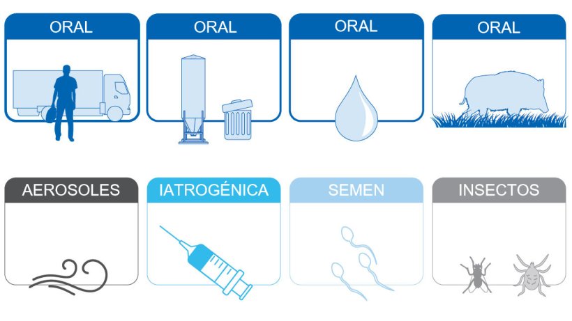 Las vías de transmisión más importantes del virus de la peste porcina africana (vPPA) son las rutas de transmisión vía oral, principalmente por la ingesta de alimentos y/o contacto con fómites/objetos contaminados con partículas víricas. La persistente viabilidad del virus, así como la dificultad para inactivarlo (Tabla 1) contribuyen a dificultar su control.