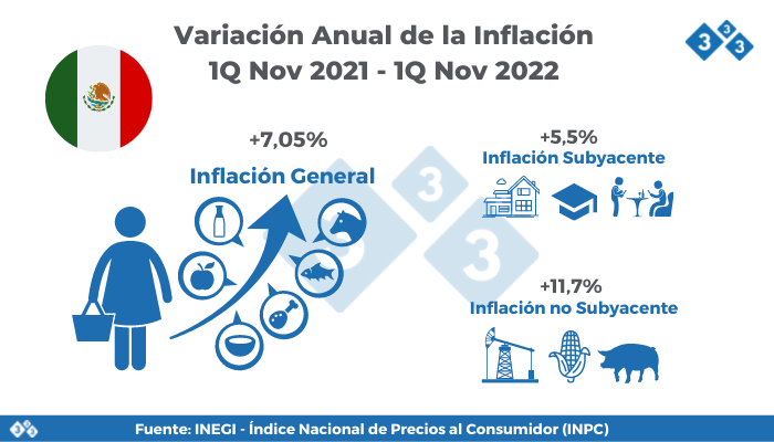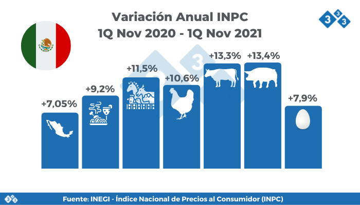 MÉXICO - De acuerdo con las últimas cifras publicadas por el Instituto Nacional de Estadística y Geografía de México (INEGI), con corte a la primera quincena de noviembre de 2021, la variación anual del Índice Nacional de Precios al Consumidor (INPC) alcanzó un récord de 7.05%.