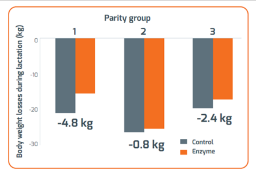 La suplementación con enzimas reduce la pérdida de peso corporal durante la lactancia, como se demuestra en un metaanálisis. La reducción media es de aproximadamente 3 kg por cerda. El efecto varía según el número de parto: las cerdas primíparas presentan mayores reducciones en la pérdida de peso que las multíparas. Esta diferencia probablemente refleja la forma en que la energía adicional, liberada por la mayor digestibilidad de la dieta, se destina: al mantenimiento de la condición corporal en desarrollo o al soporte de la producción de leche y el crecimiento de la camada.