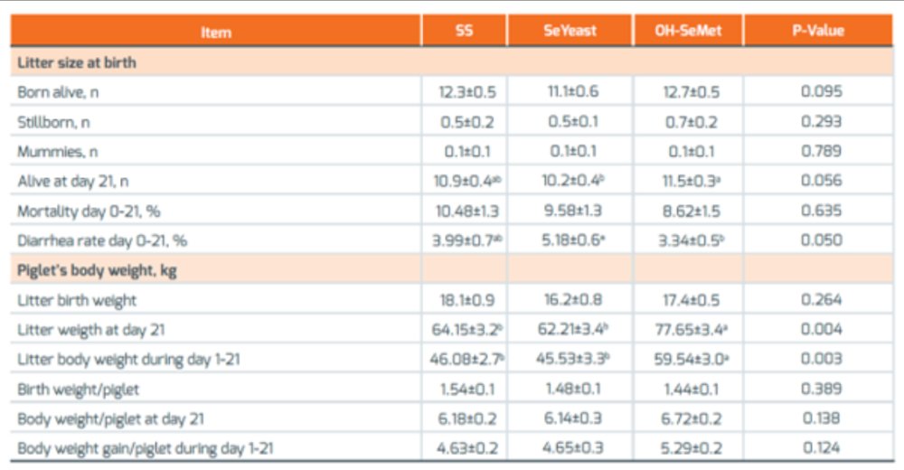 Otro estudio hecho por Adisseo evaluó la suplementación de las dietas de gestación y lactancia con selenito de sodio (SS), levadura enriquecida con selenio (Se-Levadura) y Selisseo® (OH-SeMet), bajo condiciones de verano (Índice de Temperatura y Humedad > 75). Selisseo® mejoró el estado inmunológico y redox de las cerdas, resultando en menor estrés oxidativo e inflamación. Los beneficios se transfirieron directamente a los lechones, fortaleciendo sus defensas inmunológicas y su resiliencia. Selisseo® aumentó el número de lechones vivos al nacimiento y al destete, resultando en un lechón más por cerda. Además, a diferencia del SS y de la Se-Levadura, los lechones del grupo Selisseo® presentaron un peso total de camada significativamente mayor.