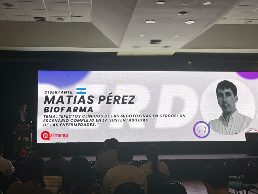 El técnico de cerdos de Biofarma, Matías Pérez, brindó una de las charlas magistrales que se llevaron a cabo, bajo la temática “Efectos clínicos de las micotoxinas en cerdos; un escenario complejo en la sustentabilidad de las enfermedades”.