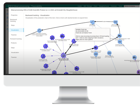 Cloudfarms también integra la plataforma de trazabilidad proporciona transparencia para visualizar y trazar toda la cadena de suministro de carne de cerdo, incluida la cosecha y almacenamiento de granos, la fábrica de piensos, la producción de cerdos, el sacrificio, el deshuesado y el procesamiento de carne. La solución permite a las empresas a lo largo de toda la cadena de valor de la carne de cerdo ingresar, analizar e intercambiar datos de forma rápida y segura. La solución de trazabilidad de Cloudfarms te permite obtener la una visión completa de la cadena de suministro y proporcionar el origen de sus productos en segundos.