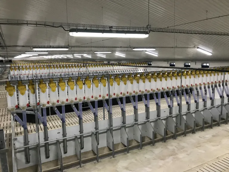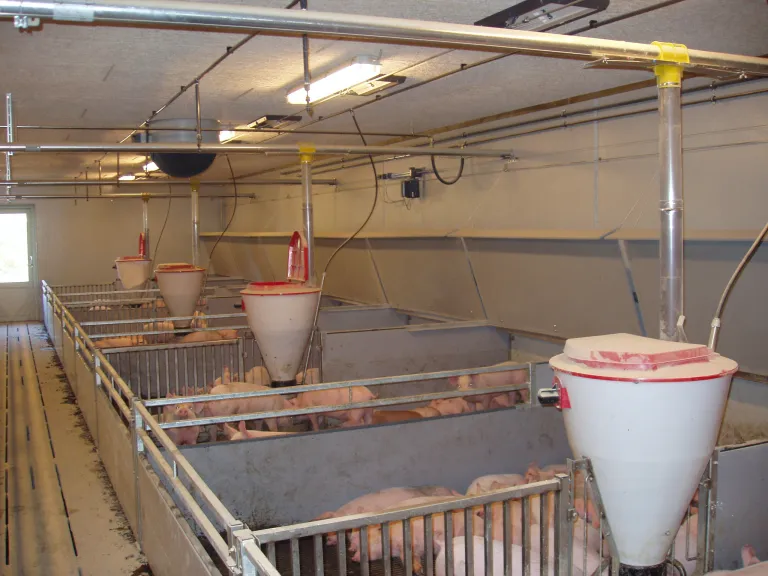 Sistemas de llenado: Los sistemas de llenado para un tipo de alimento son sistemas de alimentación básicos y fáciles de operar. Estos sistemas pueden equiparse con caídas de alimento simples y robustas para lechones y cerdos de engorde. Para cerdas, están equipados con comederos redondos EasyFeed o Daltec. Con los dispensadores redondos, llega hasta una cantidad de dosificación mínima de 0,25 l. Esta es una ventaja en la construcción de partos.