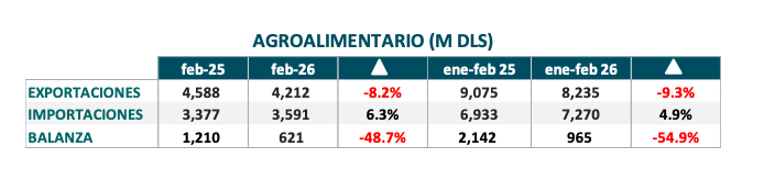 RETROCEDEN 9.3 % LAS EXPORTACIONES AGROALIMENTARIAS EN EL ACUMULADO A FEBRERO DE 2026; ALCANZAN LOS MUSD 8235