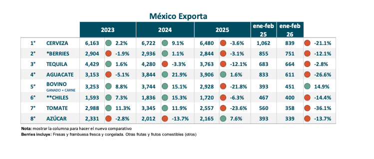 PRINCIPALES EXPORTACIONES AGROALIMENTARIAS DE MÉXICO ENE-FEB 2026 VS 2025