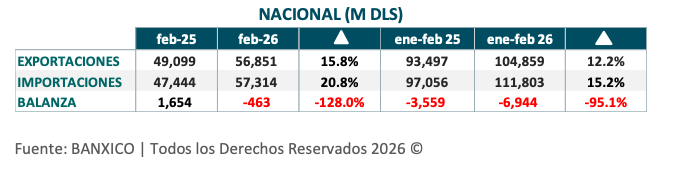 En febrero de 2026, el valor de las exportaciones totales de México alcanzó los MUSD 56 851, 15.8 % mayor al mismo mes de 2025. Por su parte, el valor de las importaciones llegó a los MUSD 57 314, con un incremento de 20.8 % comparado con el mismo mes del año previo, reflejando un saldo negativo en la balanza comercial de MUSD 463.