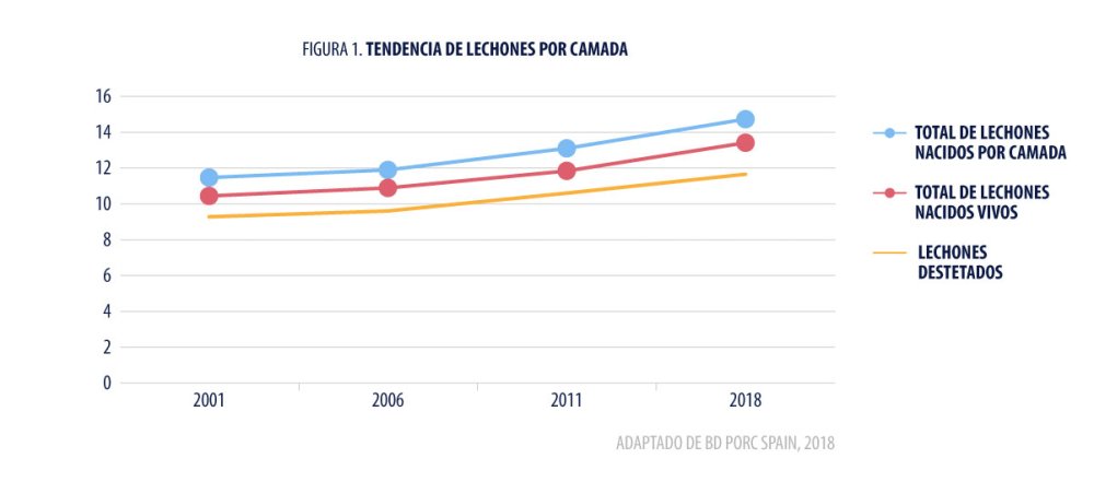 Durante los últimos años ha aumentado considerablemente el número de lechones nacidos por camada, pasando de menos de 12 hasta 15 (Bd Porc, 2018). Figura 1, lo cual ha dado lugar a ciertos inconvenientes, tales como un mayor porcentaje de lechones de bajo peso (10-15% con menos de un kg) y lo que es peor, la mortalidad en éstos es extremadamente alta, a menudo superior al 50% (Vande et al., 2020).
