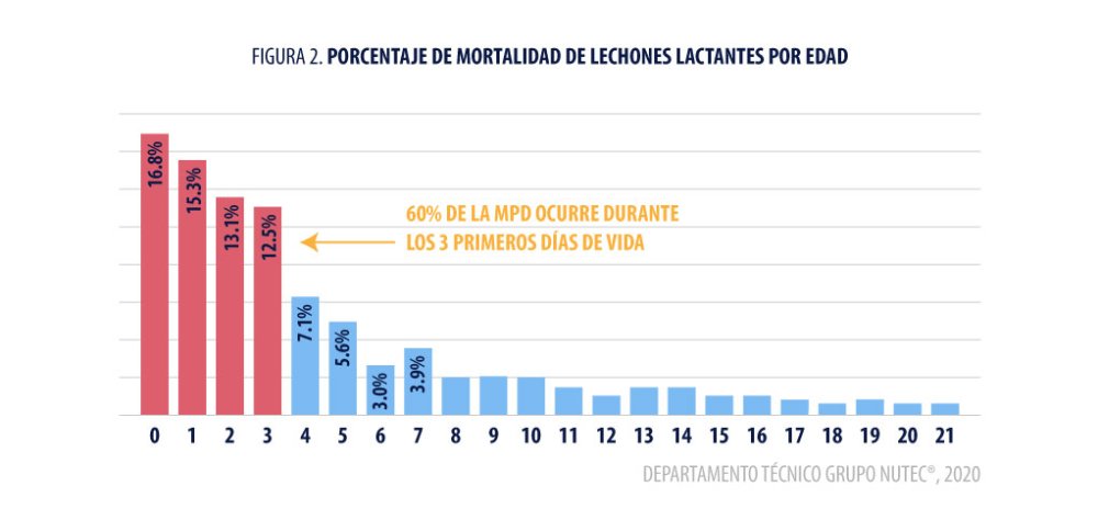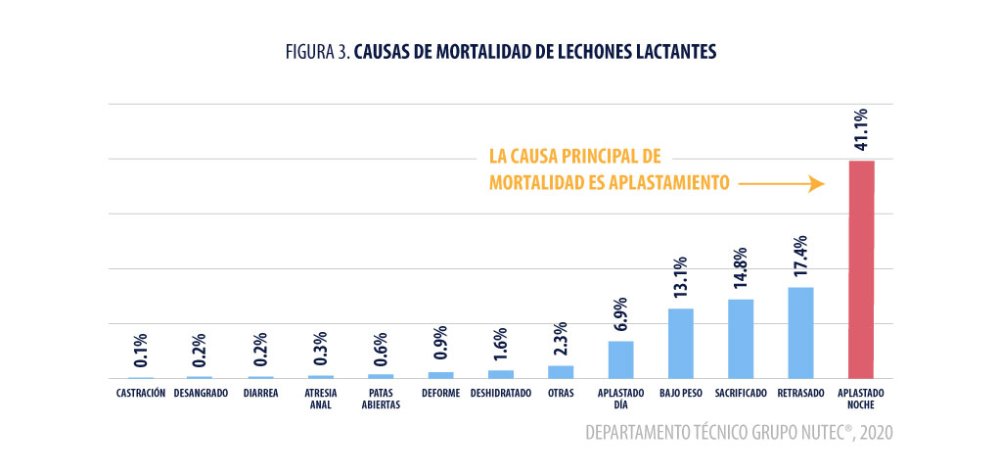 Por otro lado, se ha observado que la tasa de mortalidad pre-destete ha tenido un aumento en las operaciones comerciales alrededor del mundo, siendo hasta un 15% de los lechones nacidos vivos. Hasta el 60% de la mortalidad en maternidad ocurre durante las primeras horas de vida y la causa principal es el aplastamiento, figura 2 y 3 (GRUPO NUTEC®, 2020).