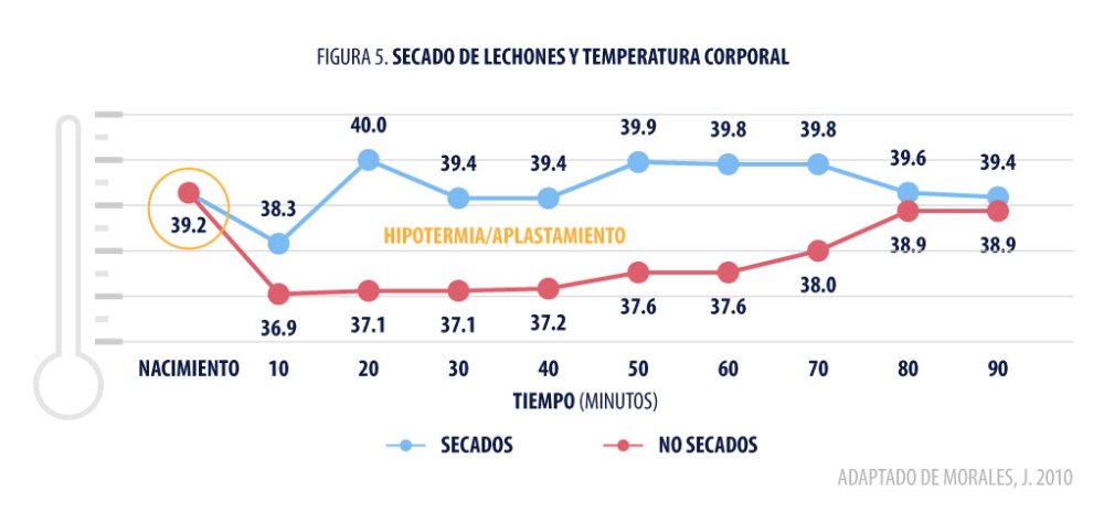 También es de suma importancia considerar la intervención de secado dentro de los procesos aplicados al recién nacido como una estrategia potencial para reducir el grado de disminución de su temperatura y con ello el riesgo de sufrir hipotermia. En la figura 5, se muestra el efecto del secado sobre el mantenimiento de la temperatura de lechones recién nacidos.