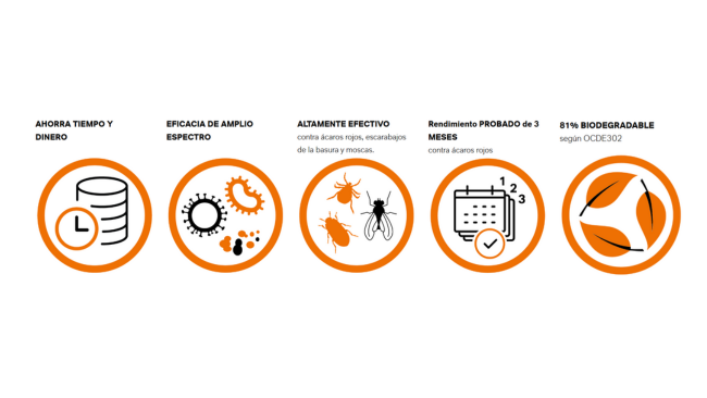 - Control de insectos y ácaros: altamente eficaz contra moscas, escarabajos y ácaros rojos, con un efecto residual comprobado de hasta tres meses.