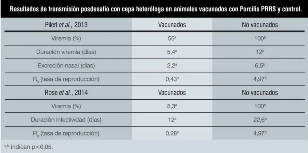 En la tabla se observan los resultados obtenidos por varios grupos de investigación (CReSA y laboratorio de Ploufragan-Plouzané) a este respecto, en los que se demuestra que en animales vacunados con Porcilis PRRS la transmisión vírica y la excreción se reducen significativamente, de manera que los valores de R0se ven reducidos a valores muy inferiores a l. Se concluye por tanto que la vacunación es una herramienta útil para controlar la diseminación del virus en una explotación o incluso área geográfica. Con esta misma base técnica, se desarrolla la estrategia de la vacunación estratégica temporal de lechones, con el objetivo de que la vacunación continuada de los lechones que se introducen en la transición elimine o reduzca sensiblemente la recirculación vírica en dicha instalación. Así, se recomienda vacunar durante 12 semanas lechones de 14 días de vida, de modo que la transmisión vírica entre animales se reduzca hasta niveles indetectables.
