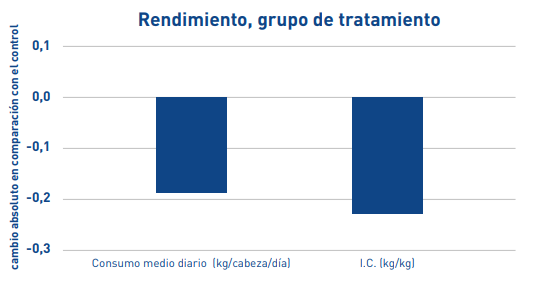 Recientemente, se realizó una prueba en condiciones prácticas en Japón. Un total de 1.000 cerdos de engorde (107 días de edad, 54 kg) se dividieron en dos grupos y se trataron durante 70 días. Las dietas se basaban en maíz, arroz y trigo con aceite vegetal añadido. Al final del período de engorde, los cerdos pesaban, de media, 114 kg. Después del sacrificio, esto significó un peso de la canal de 74 kg, de media, para ambos grupos. La adición de Excential Energy Plus al grupo de tratamiento (en la parte superior) permitió una reducción en el consumo total de alimento sin un impacto negativo en el rendimiento. Como se muestra en la figura, el consumo medio de alimento (kg/cabeza/día) fue 0,19 kg menor para el grupo de tratamiento (2,67 kg/cabeza/día) en comparación con el grupo control (2,86 kg/cabeza/día). Al calcular el IC para el período tratado, se vió una reducción de 23 puntos para el grupo de tratamiento (3,13) en comparación con el grupo de control (3,36).