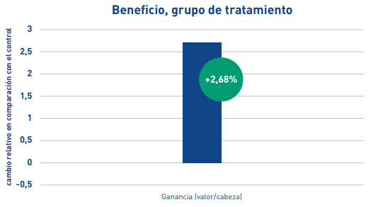 La aplicación “on top” de Excential Energy Plus significó un efecto positivo en el rendimiento de los animales tratados. Al calcular el beneficio económico, el beneficio por cabeza fue más de un 2,6 % superior para los animales tratados en comparación con los animales de control (ver la figura siguiente). Estos resultados están en línea con ensayos anteriores realizados por Orffa e institutos de investigación de todo el mundo. ¡El efecto positivo de Excential Energy Plus, específicamente en cerdos, ha sido nuevamente probado!