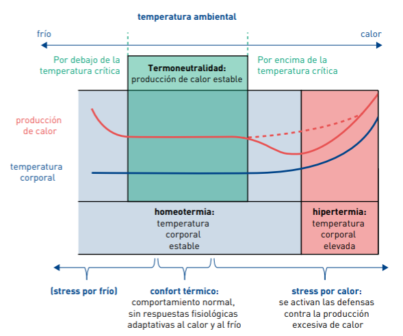 La temperatura ambiental óptima para los lechones recién nacidos está entre 32°C y 35°C. Los lechones recién nacidos no tienen mucha reserva de energía para aumentar la producción de calor y, por lo tanto, son muy vulnerables al estrés por frío. Un ambiente demasiado frío aumenta la mortalidad poco después del nacimiento. Cuando los lechones crecen, su rango de termoneutralidad disminuye y se considera que es de