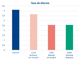 Con la inclusión de Excential Butycoat (a una dosis de 500 g/tm) en dietas de destete, las pruebas realizadas en lechones han demostrado un aumento de la ganancia media diaria (de + 3% a + 8%) y una mejora en el Índice de Conversión del alimento. Además, se ha observado una menor incidencia de diarrea. El rendimiento y la salud mejorados observados con Excential Butycoat fueron más eficaces que las dosis altas (hasta 2 kg /