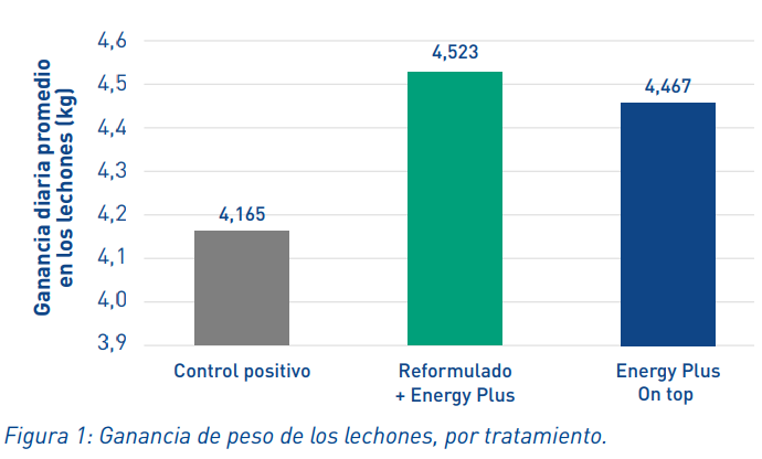 La adición del Excential Energy Pus en las dietas de cerdas en lactación incrementó la ganancia de peso desde el nacimiento y hasta el destete en un 8,6% con el tratamiento de reducción de energía y en un 7,3% para el tratamiento "on top" comparado con el control.