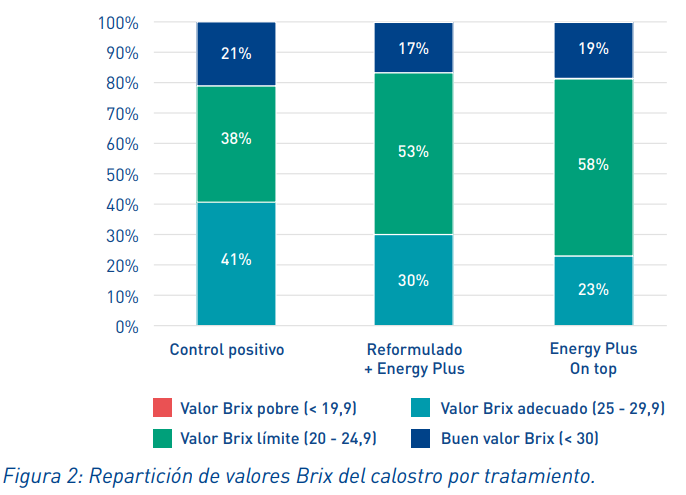 Dentro de las primeras 12 horas de producido,, se midió el valor Brix del calostro, con un refractómetro (Aparato que mide el índice de refracción). Este valor estima el contenido de inmunoglobulinas G en el calostro y refleja la calidad del mismo. Los resultados de los diferentes valores Brix en el calostro de las cerdas, fueron divididos en 4 grupos: Pobre (<19,9), limite (20-24,9), adecuado (25-29,9) y bueno (<30) (Figura 2). En esto, el Excential Energy Plus, tanto en dietas con un valor reducido de energía, como con el uso "on top", mejoró la calidad del calostro. Con una proporción mayor de cerdas teniendo un valor Brix adecuado en su calostro. Estos resultados muestran el potencial del Excential Energy Plus para mejorar la salud futura de los lechones.