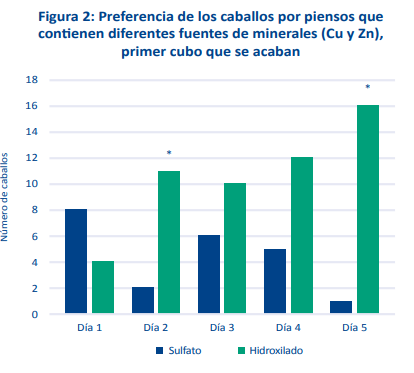 Añadir que también los caballos han mostrado preferencias por un pienso que contenía Cu y Zn de una fuente de minerales hidroxilados en comparación con el que contenía las fuentes en forma de sulfato. La ingesta de alimento a los 3 minutos fue mayor en el cubo que contenía muesli con minerales hidroxilados y este mismo cubo también fue el que se acabó en primer lugar (figura 2).