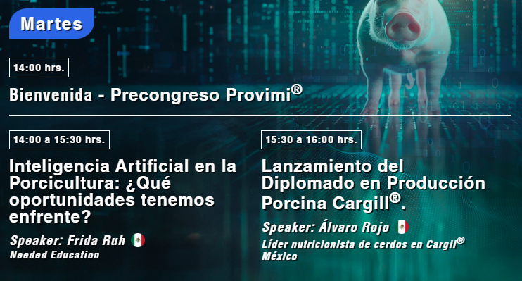 Posteriormente, de 15:30 a 16:00 hrs, Álvaro Rojo, líder nutricionista de cerdos en Cargill® México, presentará el emocionante lanzamiento del "Diplomado en Producción Porcina Cargill®", una iniciativa que promete impulsar el conocimiento y la eficiencia en el manejo porcino.