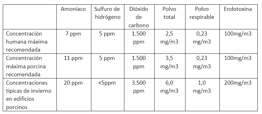 Tabla 1: Concentraciones máximas recomendadas de polvo y gases tóxicos en edificios de confinamiento porcino (Fuente: U.S. Pork Center of Excellence)