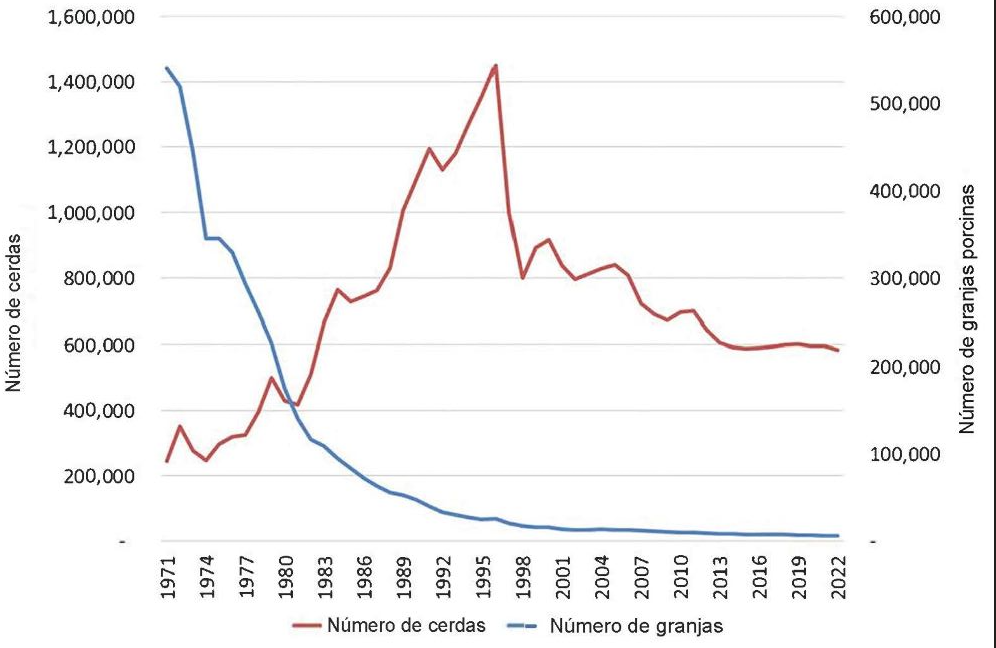 Figura 1: Número de granjas porcinas y población de cerdas en Taiwán desde 1971
