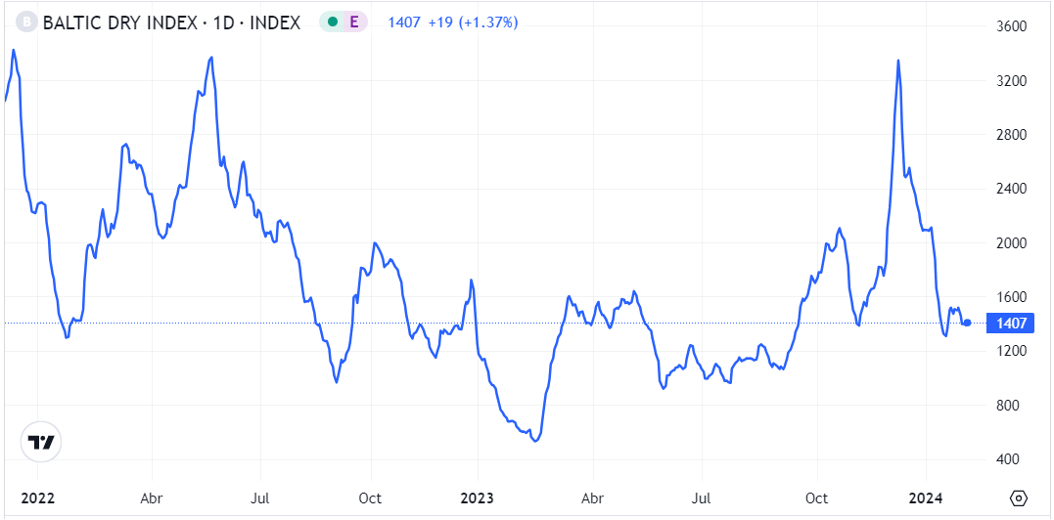 Durante el mes de enero aumentó la tensión en el Mar Rojo, con los rebeldes hutíes del Yemen atacando con misiles a los buques comerciales que circulan por el Mar Rojo. Por lo que muchas navieras han decidido evitarlo, lo que añade miles de kilómetros y 14 días más de navegación, ya que los buques deben de navegar alrededor de África, por el Cabo de Buena Esperanza. Esta situación ha impactado directamente en el aumento de los precios del petróleo y el gas, así como contribuido al aumento de los fletes.