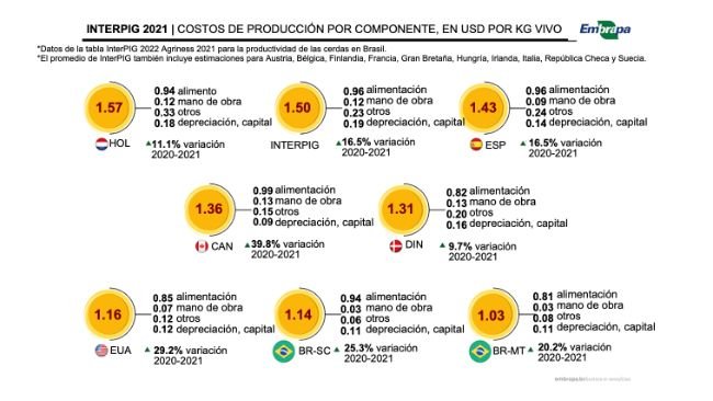 Embrapa Suínos e Aves divulgó tres gráficos con los resultados preliminares de los costos mundiales de producción porcina para 2021. Los números fueron presentados durante la reunión anual del Grupo de Comparación de Costos de Producción Porcina (InterPIG).