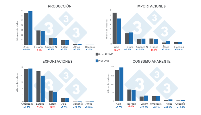- Latinoamérica (20.2 %), Asia (8.5 %) y Norteamérica (8.2 %) serían las regiones más destacadas en cuanto a las tasas de crecimiento del consumo aparente, mientras que, para Europa, se espera que el consumo caiga un 2.4 % a 2033.