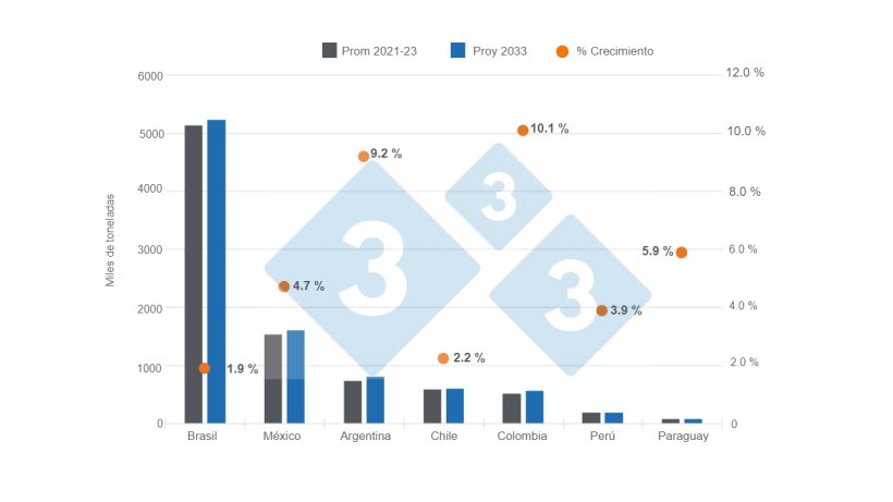 - Colombia, con un crecimiento de 10.1 % en el período de análisis y un total estimado de 557 000 toneladas (t) sería el país latinoamericano que más crecería de cara al 2033, lo seguirían Argentina (9.2 %), Paraguay (5.9 %), México (4.7 %) y Perú (3.9 %). Por su parte, Brasil y Chile, dos de los actuales líderes de la porcicultura de la región, crecerían a tasas moderadas de 1.9 y 2.2 % respectivamente.