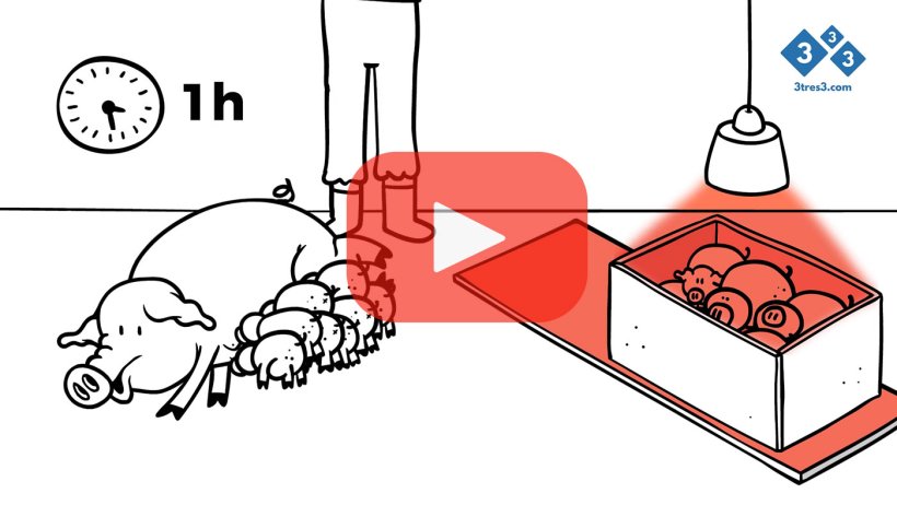 - Nous prenons les porcelets nouveau-nés et mouillés et nous les plaçons immédiatement dans une boîte ou dans le nid équipé d'une source de chaleur et d'une poudre de séchage (nous pouvons aussi les sécher auparavant). Idéalement, au moment de les introduire, nous devrions les marquer sur le dos avec une craie de couleur.