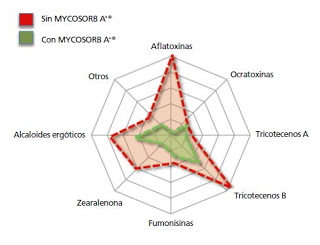 - Un adsorbente de micotoxinas de amplio espectro, de eficacia demostrada, que neutraliza el cuadro completo de la contaminación por micotoxinas, en lugar de lidiar con las micotoxinas de forma individual
