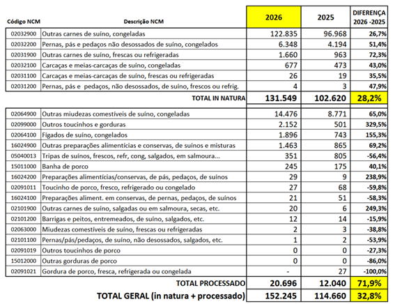 Tabela 1. Exportações brasileiras de carne suína total (in natura e processados) em MARÇO de 2026, em toneladas, comparado a março de 2025.