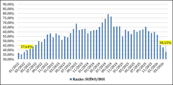 Gráfico 3. Relação percentual (razão) entre o valor mensal do quilograma da carcaça suína e o valor do quilograma da carcaça bovina em São Paulo (SP). Em destaque o mês de abril/26 (média até dia 20/04) e o mês de março/22, último mês em que esteve abaixo de 38%.