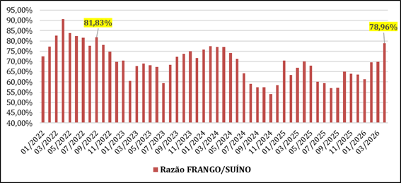Gráfico 4. Relação percentual (razão) entre o valor mensal do kg de frango resfriado e o valor do quilograma da carcaça suína em São Paulo (SP). Em destaque o mês de abril/26 (média até dia 20/04) e o mês de setembro/22, último mês em que esteve acima de 78%.
