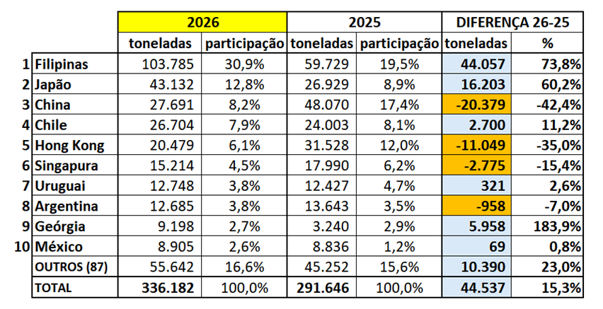 No acumulado do ano, fechamos o primeiro trimestre de 2026 com 15,3% (+44,5 mil toneladas) a mais de carne in natura que o mesmo período do ano passado (tabela 2), com destaque para as Filipinas, que no período representou mais de 30% do volume exportado.
