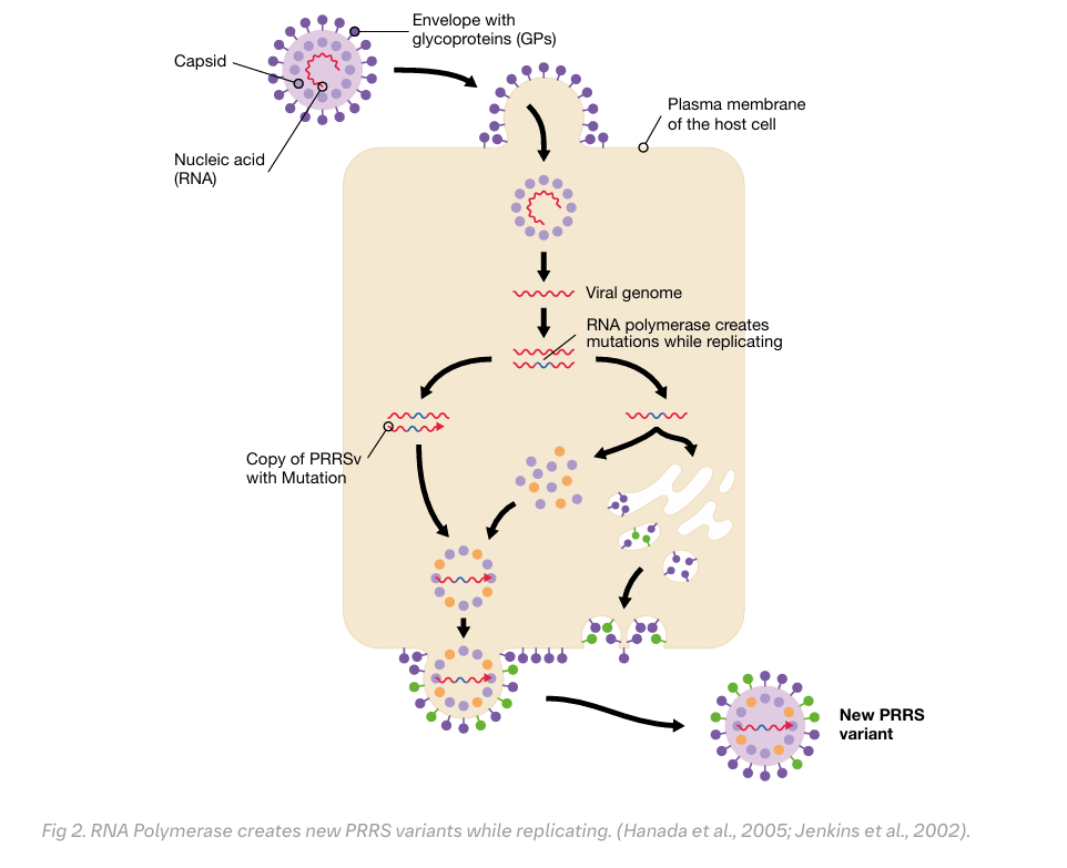 The enzyme PRRS virus uses for replication is very efficient in producing copies, but lacks a proofreading. So the newly produced viruses are a cloud of variants or mutants resulting in a great diversity. The PRRSv evolution is further accelerated when two different viruses infect a single cell. Therefore, PRRSv is the most diverse virus, resulting in even a greater diversity than human immunodeficiency virus (HIV) and Influenza A virus (IAV). To reflect this huge diversity, PRRSv is clustered in two species (PRRSv-1 and PRRSv-2), lineages and sub-lineages.