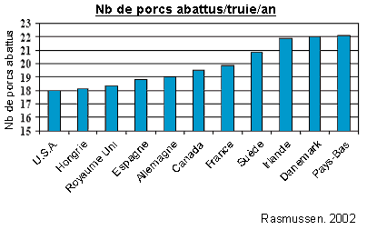 L'objectif de l’élevage des reproductrices est de produire systématiquement un nombre défini de porcs sevrés de bonne qualité à coût réduit. Les données d'une étude récente indiquent que l'Espagne a des coûts de production relativement faibles (figure 1) mais elle est moins compétitive quant au nombre de porcs abattus par truie et par année (figure 2). La France se situe dans la moyenne mais n’a pas la meilleure productivité.