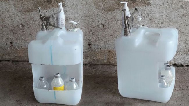 Trois tubes en plastique sont fixés à l'aide de colliers de serrage au seau. Ils serviront à contenir trois seringues différentes que nous pourrons utiliser pour différents traitements antibiotiques ou anti-inflammatoires. La longueur du tube est calculée en fonction de la longueur de la seringue, y compris l'aiguille, afin que, lorsqu'elle est placée à l'intérieur, l'aiguille ne touche pas le fond et ne soit donc pas endommagée, même s'il est toujours préférable de retirer l'aiguille après chaque traitement. Les supports externes permettent de le fixer aux séparations des parcs, à une hauteur confortable pour leur utilisation.