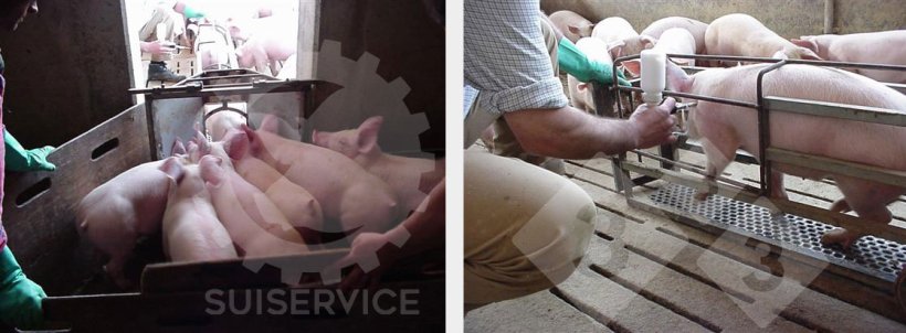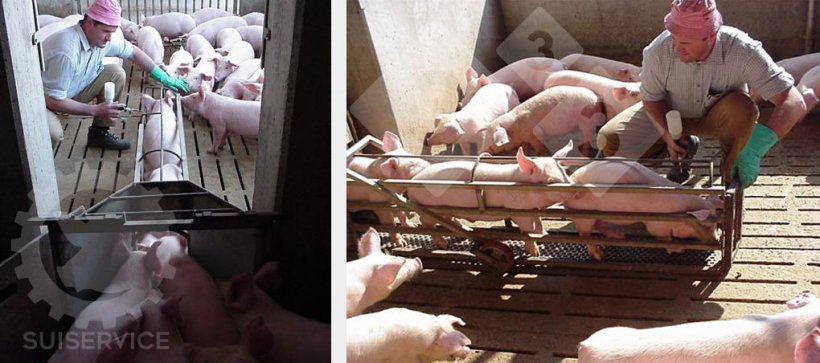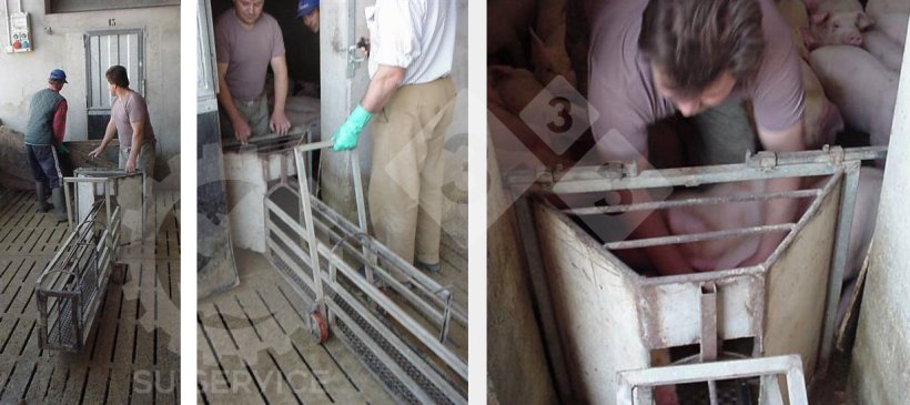 Lorsque les porcelets sont dans une case, la goulotte est placée à la porte menant au parc extérieur. De l'intérieur, deux opérateurs, à l'aide de panneaux de bois, poussent les animaux vers le tunnel, tandis que le vaccinateur attend leur arrivée de l'autre côté, alors qu'ils avancent en file indienne, et procède à la vaccination.