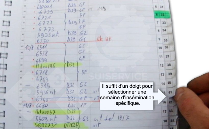 Depuis plusieurs années, SUIVET propose un cahier d'enregistrement dont chaque page correspond à une semaine de l'année, où l'on peut enregistrer toutes les inséminations effectuées pendant la semaine : la page précédente et la page suivante contiennent les inséminations des semaines respectives.