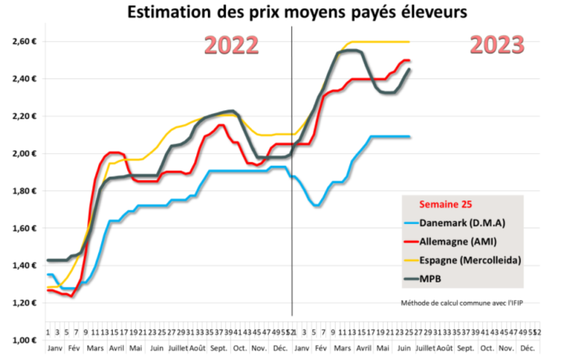 Depuis le 8 juin dernier, les ventes de porcs se déroulent en mode « vente obligatoire » au Marché du Porc Breton, motivé en raison des offres de porcs insuffisantes qui contraignent les abattoirs à enchérir suffisamment pour garantir leur approvisionnement au MPB. Dans ce contexte, le cours a progressé de 1,1 centime le lundi 19 juin et de 3,4 centimes le jeudi 22 juin. Comme constaté dans d’autres bassins européens, certains abattoirs ont réduit leur activité sur 4 jours pour un temps indéterminé. Cela a occasionné une baisse de 12 000 porcs abattus la semaine dernière par rapport à l’activité précédente pour 347 253 porcs. Cela n’a pas empêché les poids de poursuivre leur repli de 571 g à 95,25 kilos pour une baisse de 1,5 kilo en 3 semaines. Malgré cette forte chute des poids, ils restent supérieurs de 720 grammes à la même référence 2022.