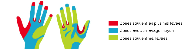 - Se laver les mains avec de l'eau et du savon quand elles sont visuellement sales ou ont été en contact avec du sang ou d'autres fluides corporels ou après le bain.