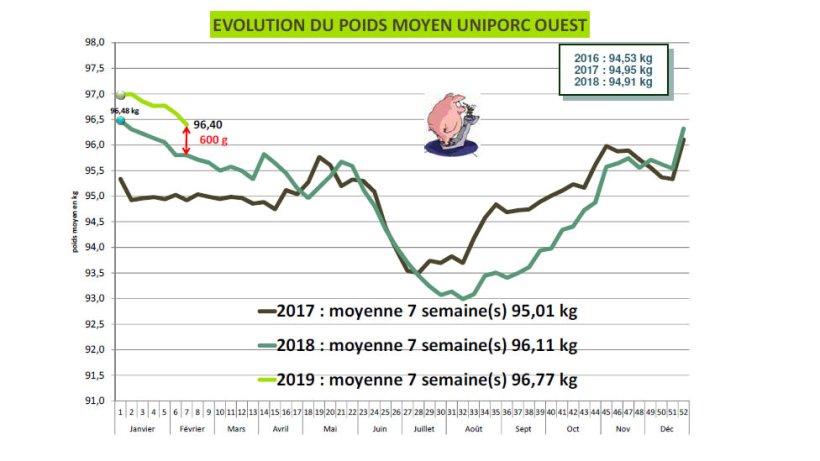 Après la perte de 3 millièmes sur le marché de lundi, le cours s’est stabilisé jeudi à 1,178 euro. Contrairement aux autres cotations du nord de l’Europe et de la référence espagnole, la référence française peine à se redresser. La lente régression des poids moyens sur la zone Uniporc Ouest traduit toujours un marché de l’offre très encombré. A 96,55 kilos de moyenne, la baisse de la semaine dernière n’a pas excédé 100 g, et les poids restent supérieurs de 750 g à la même référence de l’an dernier. Tant que ce manque de fluidité persistera, un redressement sensible des cours semble compromis. Pourtant, depuis 5 semaines, l’activité moyenne est de 384 000 porcs abattus (385 482 la semaine passée), supérieure de 3 000 porcs hebdo à la même période 2018. La demande de cette deuxième quinzaine de février restera probablement calme d’autant plus que la deuxième zone a commencé ses congés scolaires avec toutes les perturbations que cela implique.