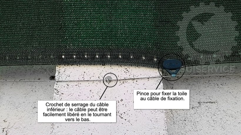 Deux câbles parallèles en acier tressé sont fixés au-dessus et au-dessous des fenêtres sur toute la longueur du bâtiment, avec un tendeur aux extrémités pour maintenir la toile tendue.